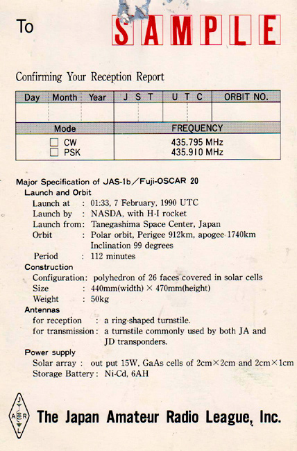 This is a sample QSL card that would confirm reception of a beacon aboard. The Japanese satellite Fuji Oscar 20 (launched 17 August 1996).