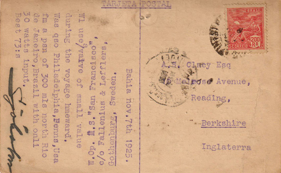 Card mailed from Bahia, Brazil, 7 November 1925. with Brazil stamp.