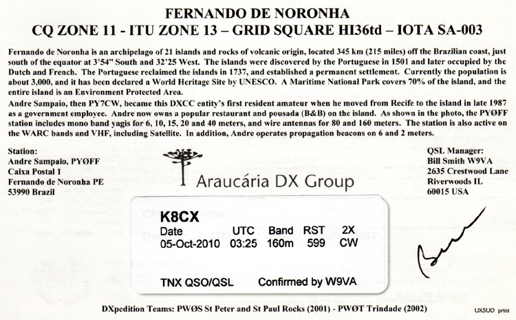 Operator: Andre Cavalcante Sampaio, PY0FF and other calls PP6ZZ and PY7CW. Andre became a Silent Key September 24, 2020 due to health problems after surgery.