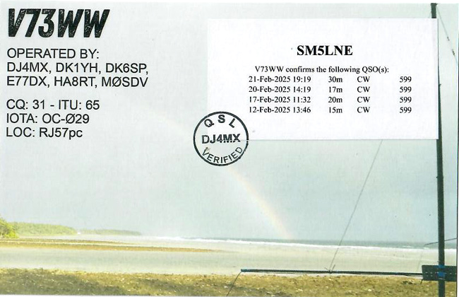 Listen to V73WW on 15 Meter CW! Listen to V73WW on 10 Meter SSB! Listen to V73WW on 20 Meter CW! Listen to V73WW on 17 Meter CW!
