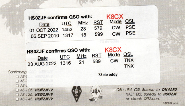Listen to HS0ZJF in 2010 on 17 Meter CW Listen to HS0ZJF in 2022 on 15 Meter CW Listen to HS0ZJF in 2022 on 10 Meter CW